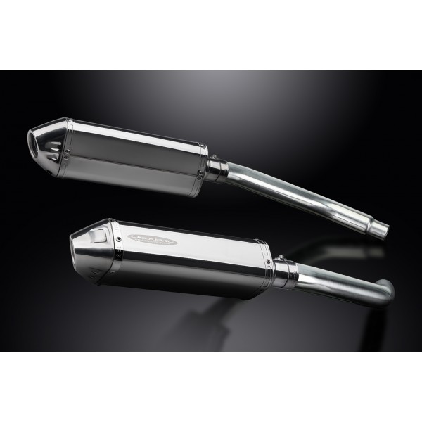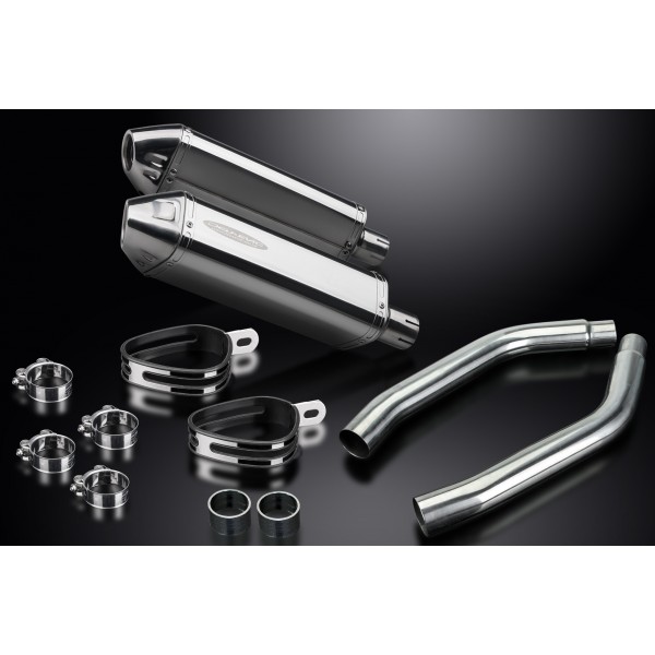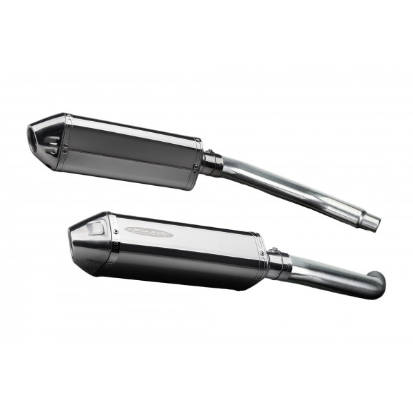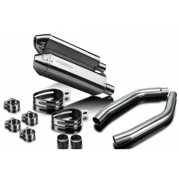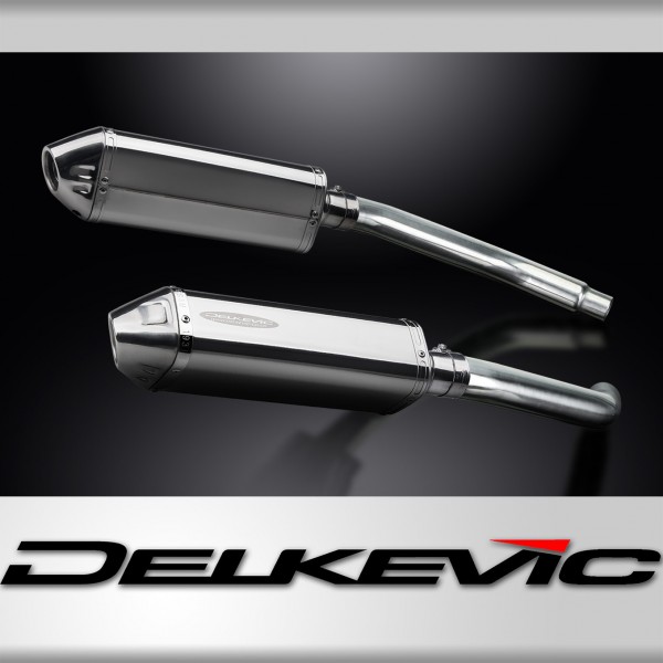 • This set includes - Delkevic silencers with a removable baffle, link pipes, silencer straps, gaskets, and clamps.