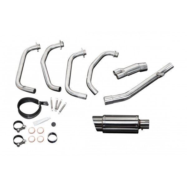• This set includes - Delkevic down pipes, link pipe, silencer with a removable baffle, strap, clamps, gaskets, and spring hooks.