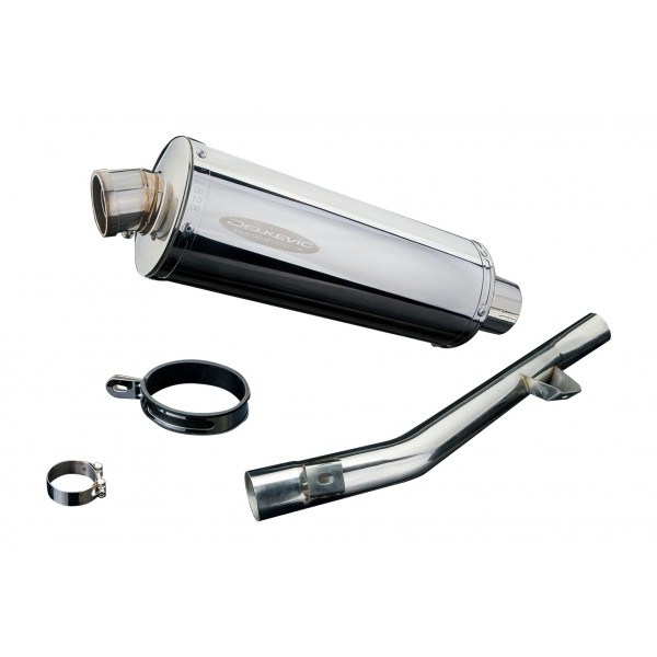• This set includes - Delkevic silencer with a removable baffle, link pipe, silencer strap, gasket and clamps.
