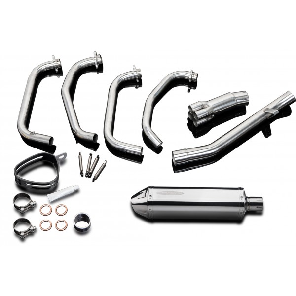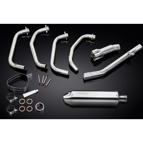 • This set includes - Delkevic down pipes, link pipe, silencer with a removable baffle, strap, clamps, gaskets, and spring hooks.