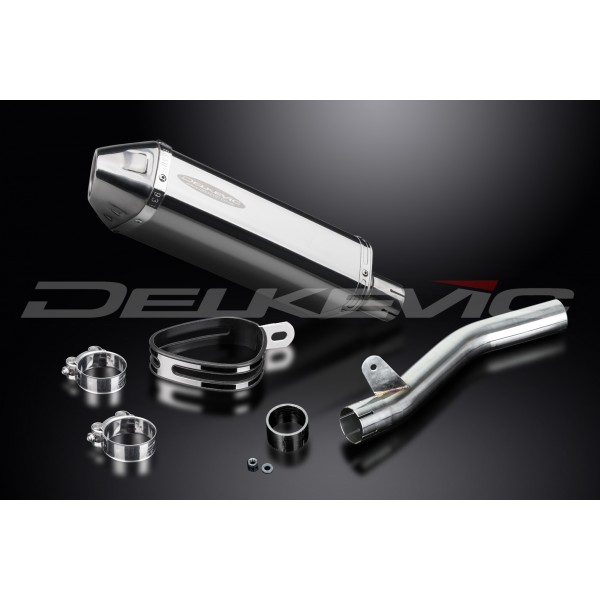 • This set includes - Delkevic silencer with a removable baffle, link pipe, strap, gasket, nyloc nut, washer, and clamps.