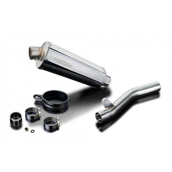 • This set includes - Delkevic silencer with a removable baffle, link pipe, strap, gasket, nyloc nut, washer, and clamps.