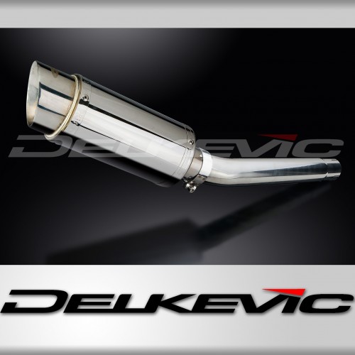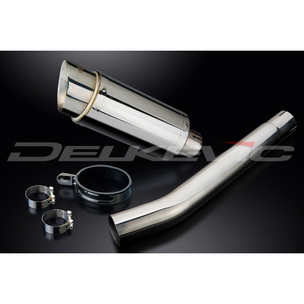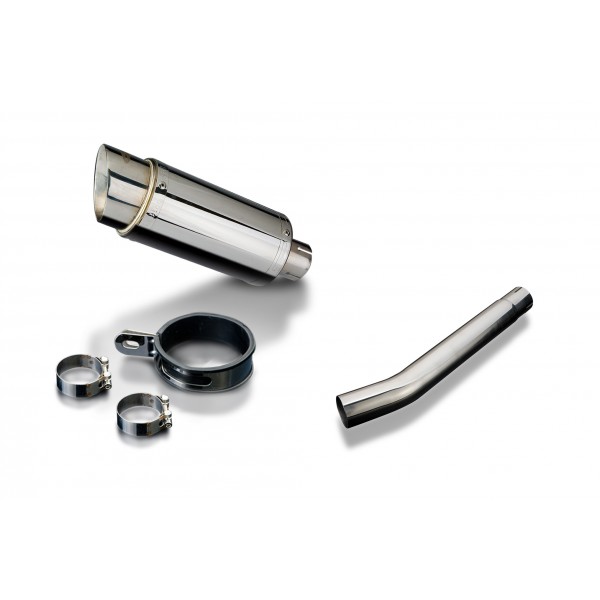• This set includes - Delkevic silencer with a removable baffle, link pipe, clamps, and strap.