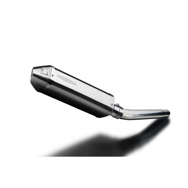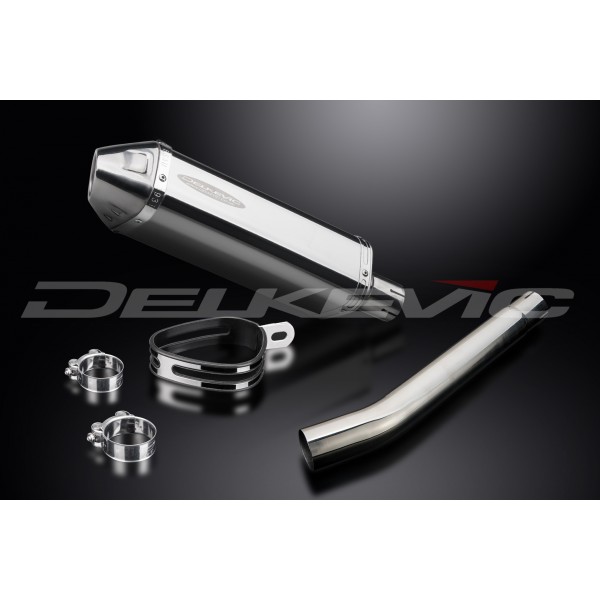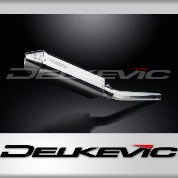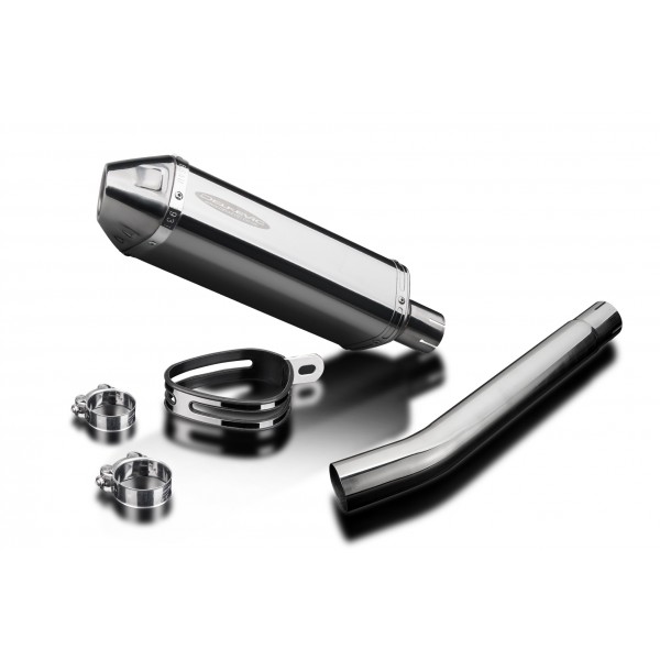 • This set includes - Delkevic silencer with a removable baffle, link pipe, clamps, and strap.