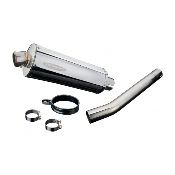• This set includes - Delkevic silencer with a removable baffle, link pipe, clamps, and strap.