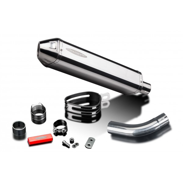 • This set includes - Delkevic silencer with a removable baffle, link pipe, strap, and clamps.