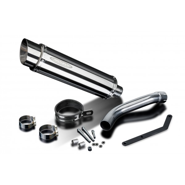 • This set includes - Delkevic silencer with a removable baffle, link pipe, silencer strap, spacers, cap screw, washers, nyloc nut, bracket, and clamps.