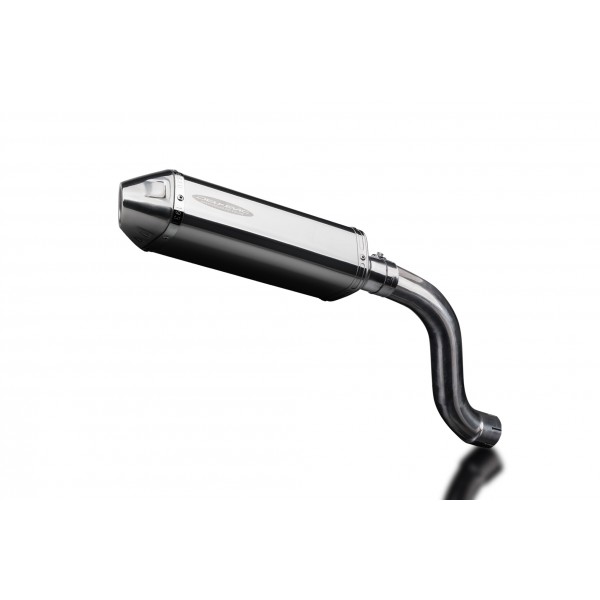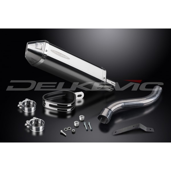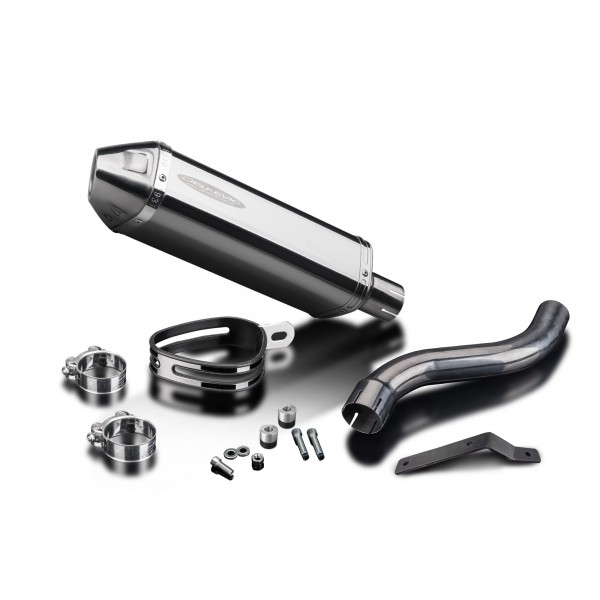 • This set includes - Delkevic silencer with a removable baffle, link pipe, clamps, and strap.