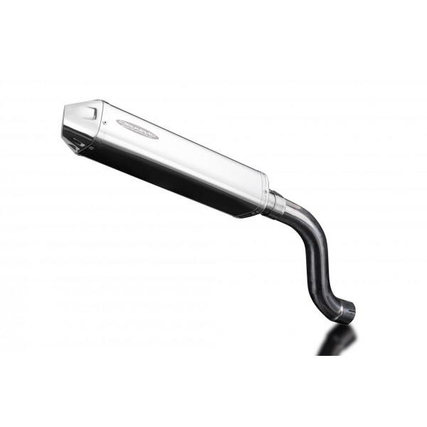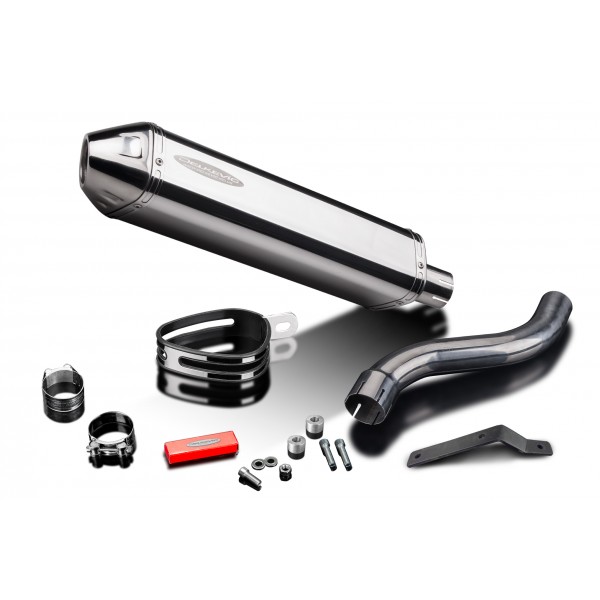 • This set includes - Delkevic silencer with a removable baffle, link pipe, clamps, and strap.