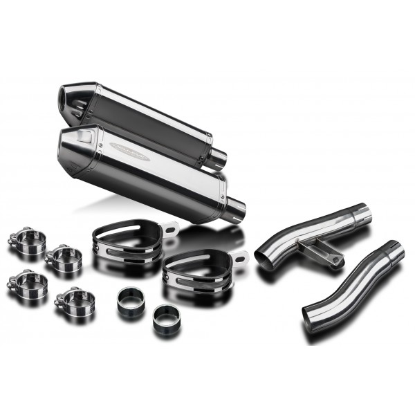 • This set includes - Delkevic silencers with removable baffles, link pipes, straps, gaskets, and clamps.