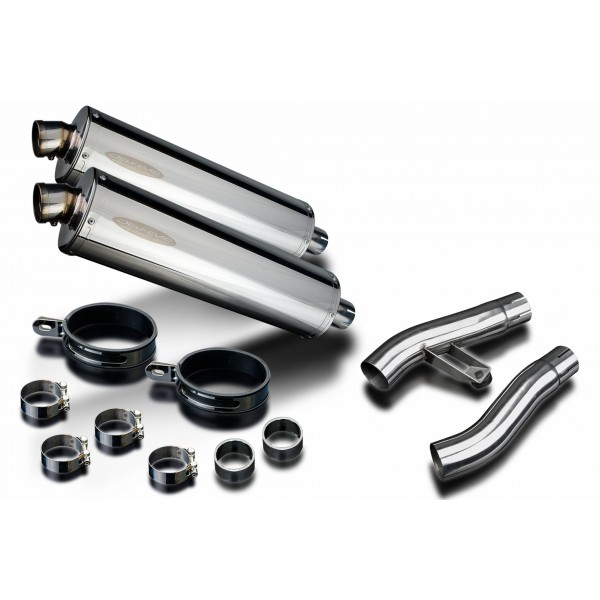 • This set includes - Delkevic silencers with removable baffles, link pipes, straps, gaskets, and clamps.
