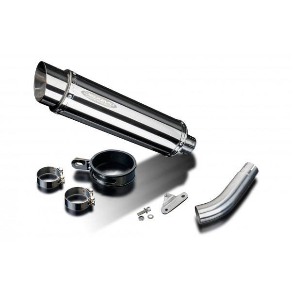 • This set includes - Delkevic silencer with a removable baffle, link pipe, clamps, and strap.