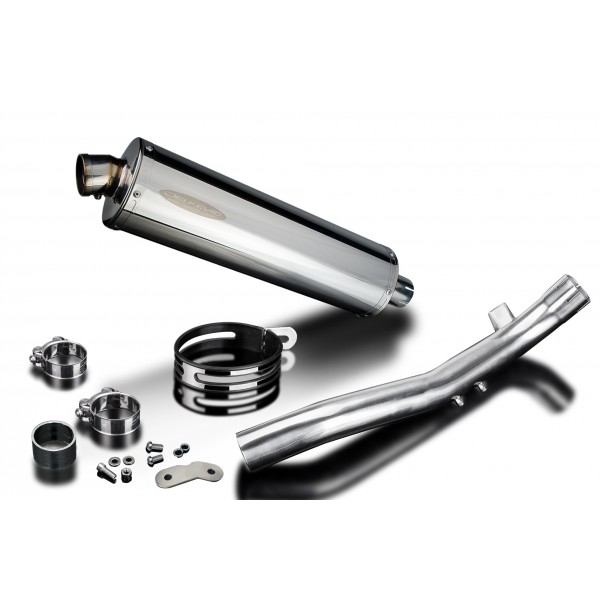 • This set includes - Delkevic silencer with a removable baffle, link pipe, silencer strap, bracket, cap screw, button head screws, washers, nyloc nut, and clamps.