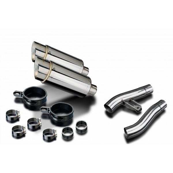 • This set includes - Delkevic silencers with removable baffles, link pipes, straps, gaskets, and clamps.