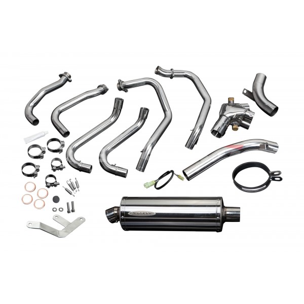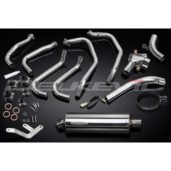 • This set includes - Delkevic down pipes, link pipe, silencer with a removable baffle, strap, clamps, gaskets, stand stop rubber, spring hooks, bracket, and wiring kit.