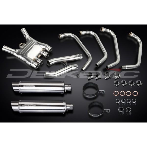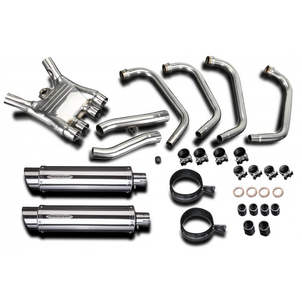 • This set includes - Delkevic down pipes, collector box, link pipes, silencers with removable baffles, straps, clamps, stand stop rubber, and gaskets.