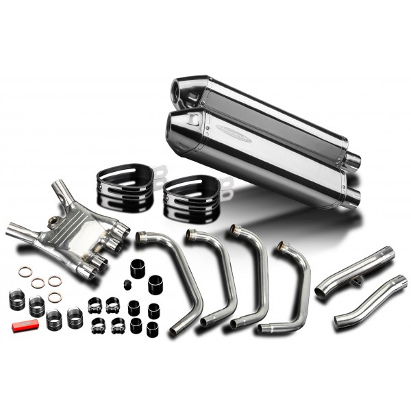 • This set includes - Delkevic down pipes, collector box, link pipes, silencers with removable baffles, straps, clamps, stand stop rubber, and gaskets.
