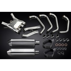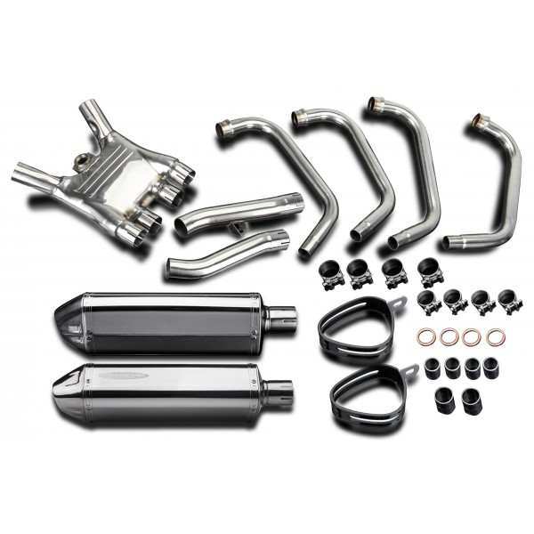 • This set includes - Delkevic down pipes, collector box, link pipes, silencers with removable baffles, straps, clamps, stand stop rubber, and gaskets.