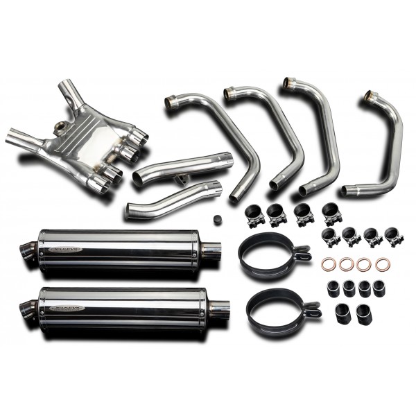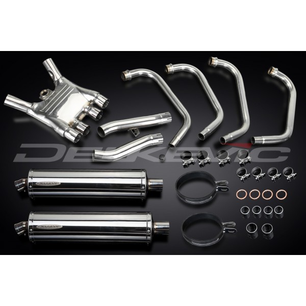 • This set includes - Delkevic down pipes, collector box, link pipes, silencers with removable baffles, straps, clamps, stand stop rubber, and gaskets.