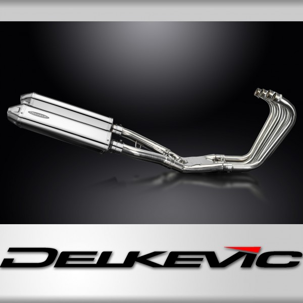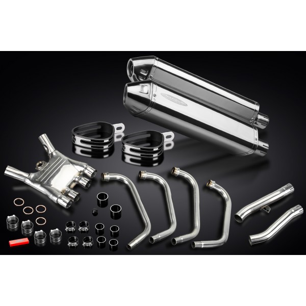 • This set includes - Delkevic down pipes, collector box, link pipes, silencers with removable baffles, straps, clamps, stand stop rubber, and gaskets.