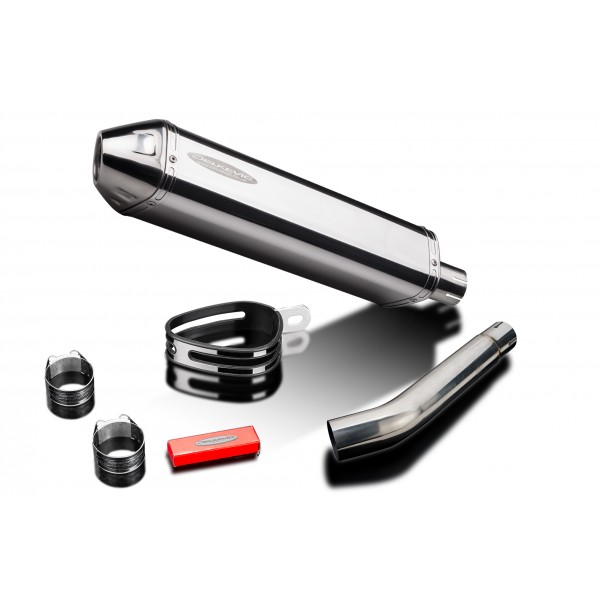 • This set includes - Delkevic silencer with a removable baffle, link pipe, clamps, and strap.