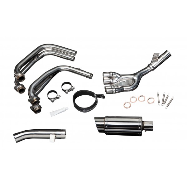 • This set includes - Delkevic down pipes, link pipe, silencer with a removable baffle, strap, clamps, gaskets, and spring hooks.