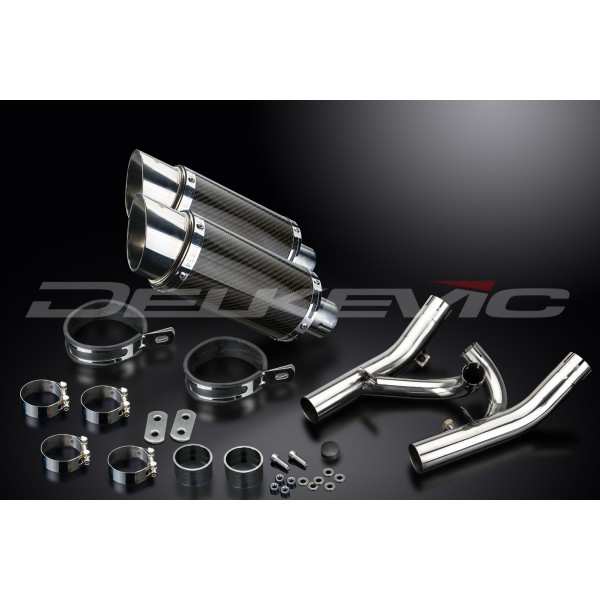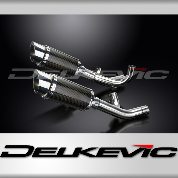 • This set includes - Delkevic silencers with removable baffles, de-cat link pipes, straps, brackets, gaskets, nyloc nuts, stand stop rubber, washers, cap screws, and clamps.