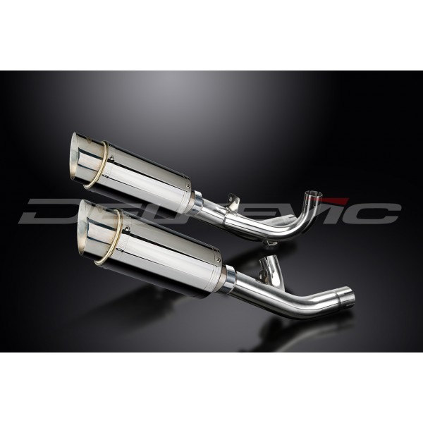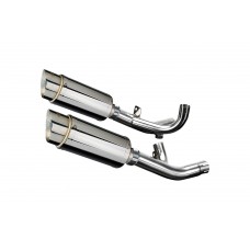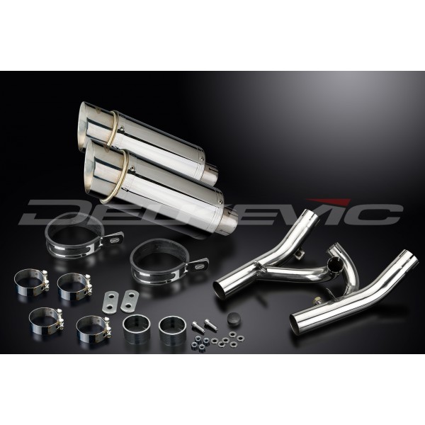 • This set includes - Delkevic silencers with removable baffles, de-cat link pipes, straps, brackets, gaskets, nyloc nuts, stand stop rubber, washers, cap screws, and clamps.