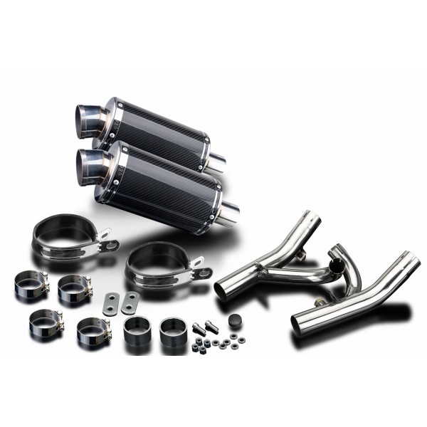 • This set includes - Delkevic silencers with removable baffles, de-cat link pipes, straps, brackets, gaskets, nyloc nuts, stand stop rubber, washers, cap screws, and clamps.