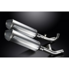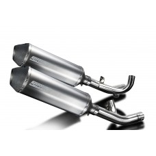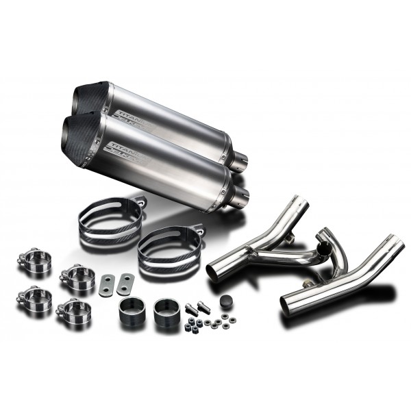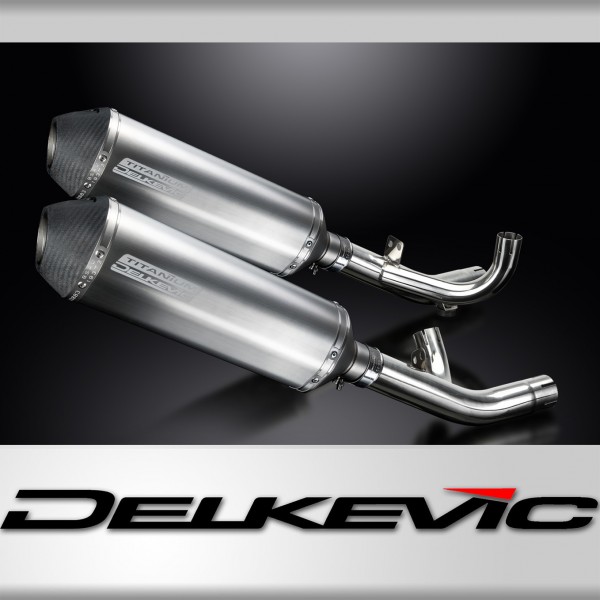 • This set includes - Delkevic silencers with removable baffles, de-cat link pipes, straps, brackets, gaskets, nyloc nuts, stand stop rubber, washers, cap screws, and clamps.