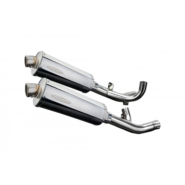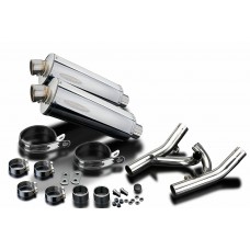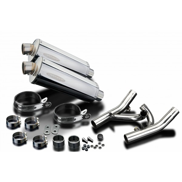 • This set includes - Delkevic silencers with removable baffles, de-cat link pipes, straps, brackets, gaskets, nyloc nuts, stand stop rubber, washers, cap screws, and clamps.