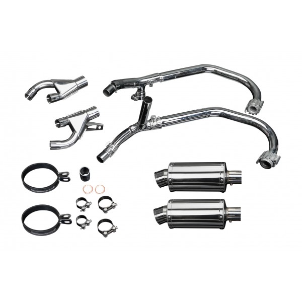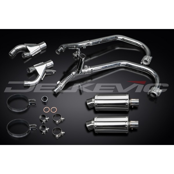 • This set includes - Delkevic down pipes, link pipes, silencers with removable baffles, straps, clamps, and gaskets.
