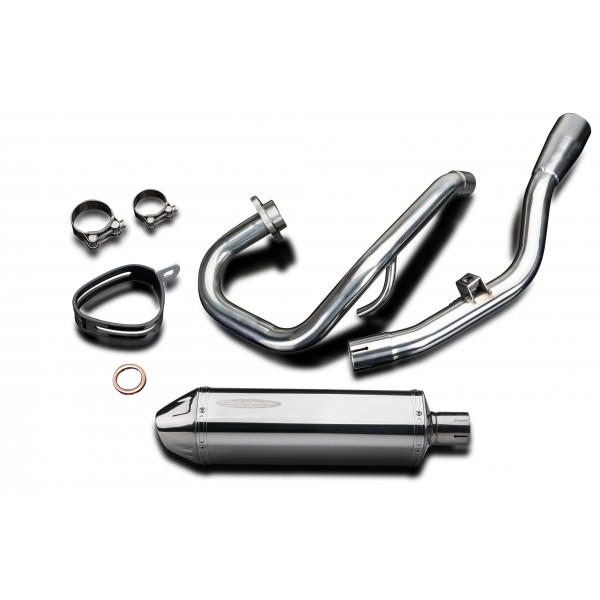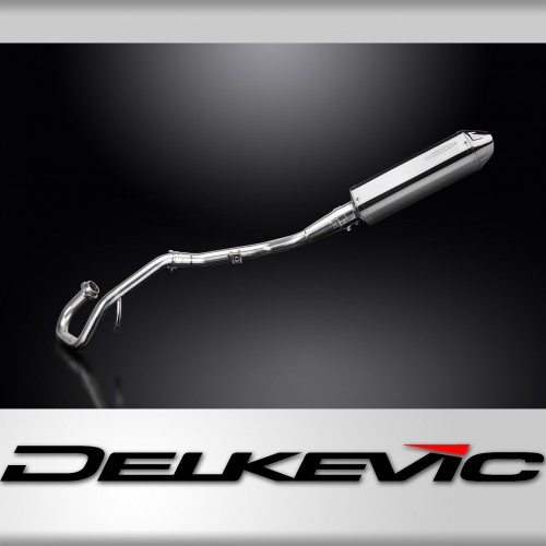 • This set includes - Delkevic De-Cat down pipe, link pipe, Delkevic silencer with a removable baffle, strap, clamps, and gasket.