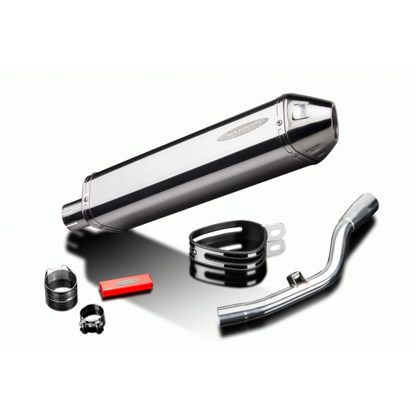 • This set includes - Delkevic silencer with a removable baffle, link pipe, silencer strap, and clamps.