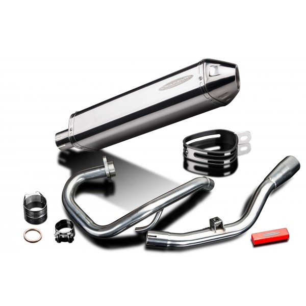• This set includes - Delkevic De-Cat down pipe, link pipe, Delkevic silencer with a removable baffle, strap, clamps, and gasket.