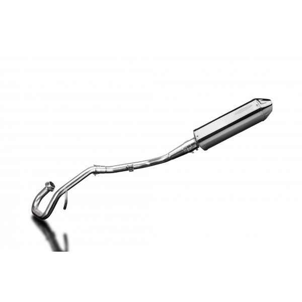 • This set includes - Delkevic De-Cat down pipe, link pipe, Delkevic silencer with a removable baffle, strap, clamps, and gasket.