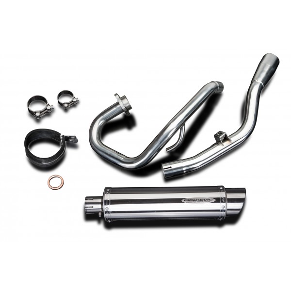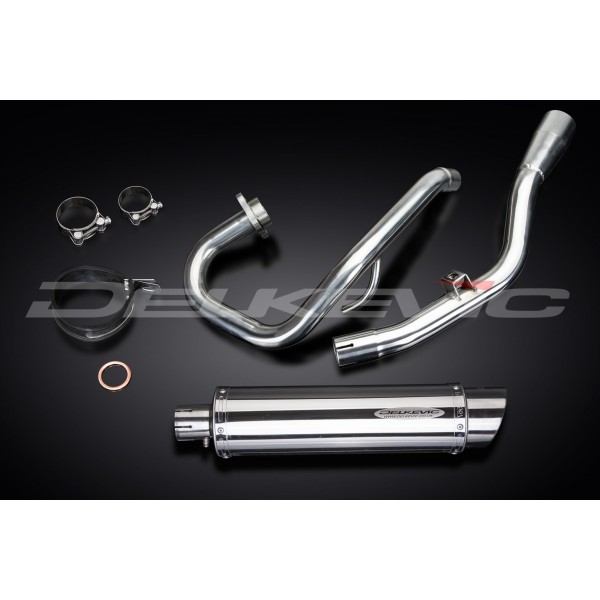 • This set includes - Delkevic De-Cat down pipe, link pipe, Delkevic silencer with a removable baffle, strap, clamps, and gasket.