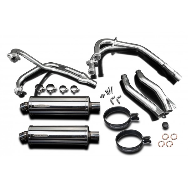 • This set includes - Delkevic down pipes, link pipes, silencers with removable baffles, straps, clamps, gaskets, cap screws, nyloc nuts, brackets, and stand stop rubber.