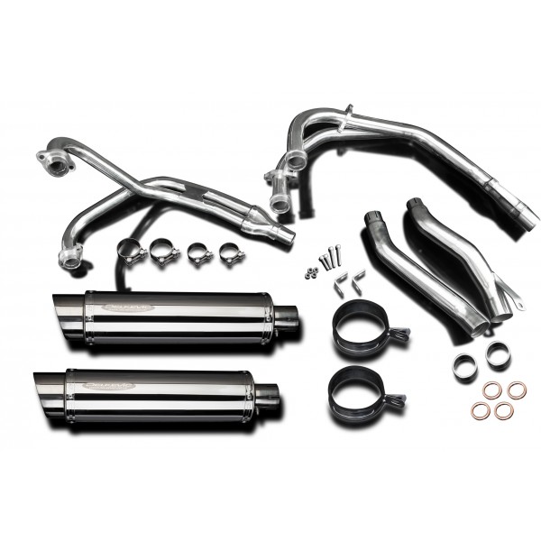 • This set includes - Delkevic down pipes, link pipes, silencers with removable baffles, straps, clamps, gaskets, cap screws, nyloc nuts, brackets, and stand stop rubber.