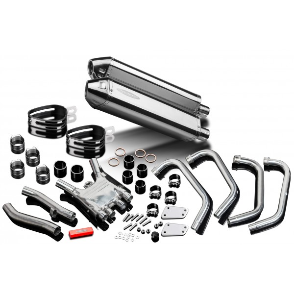 • This set includes - Delkevic down pipes, collector box, link pipes, silencers with removable baffles, straps, clamps, gaskets, washers, cap screws, nyloc nuts, and brackets.