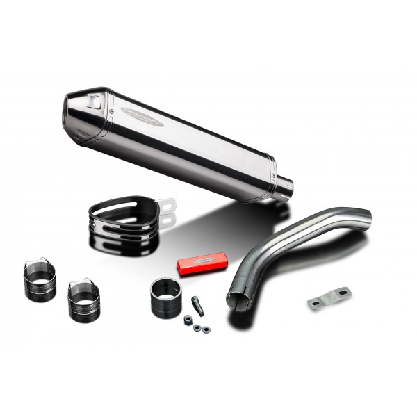 - This set includes - Delkevic silencer with a removable baffle, link pipe, strap, clamps, cap screw, nyloc nut, bracket, gasket, and washers.