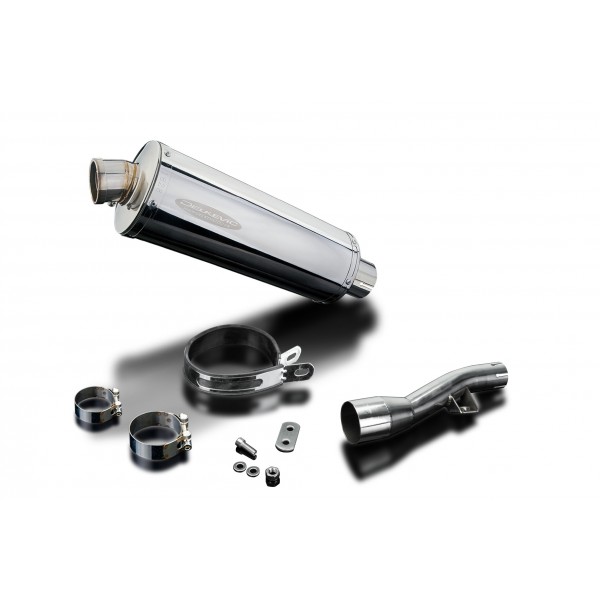 • This set includes - Delkevic silencer with a removable baffle, link pipe, silencer strap, cap screw, washers, nyloc nut, bracket, and clamps.
