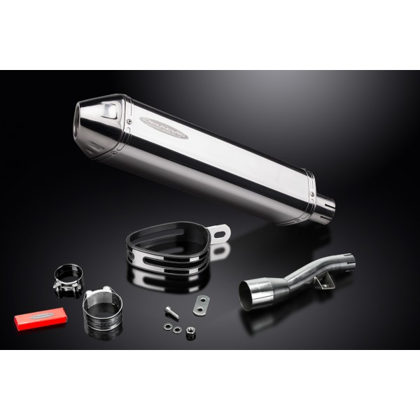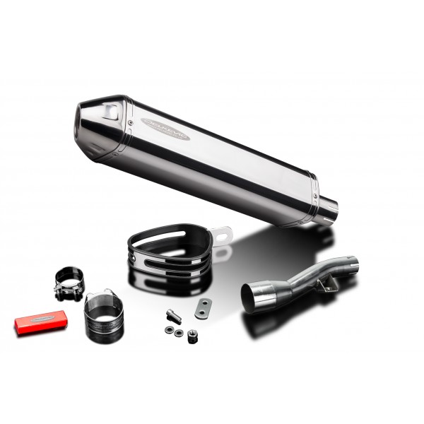 • This set includes - Delkevic silencer with a removable baffle, link pipe, silencer strap, cap screw, washers, nyloc nut, bracket, and clamps.