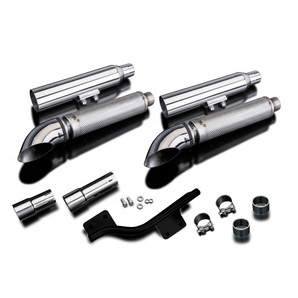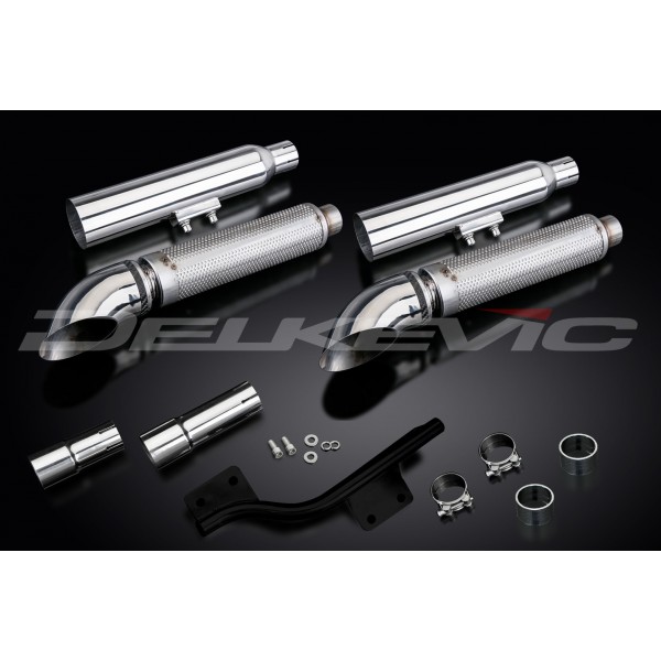 • This set includes - Delkevic silencers with removable baffles, link pipes, bracket, washers, cap screws, gaskets, and clamps.