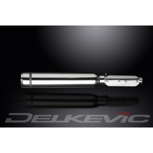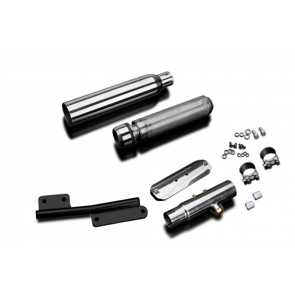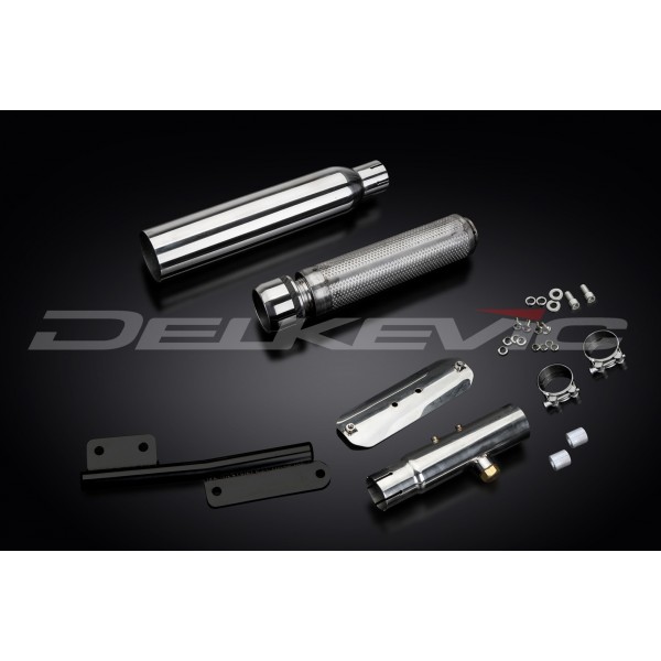 • This set includes - Delkevic silencer with a removable baffle, link pipe, clamps, screws, washers, spacers, and bracket.