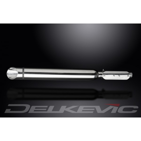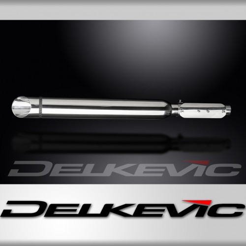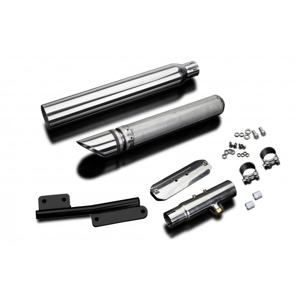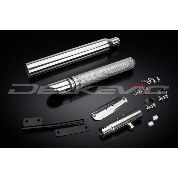 • This set includes - Delkevic silencer with a removable baffle, link pipe, clamps, screws, washers, spacers, and bracket.