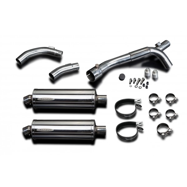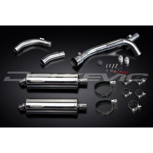 • This set includes - Delkevic silencers with removable baffles, de-cat link pipe, link pipes, straps, clamps, and brackets.