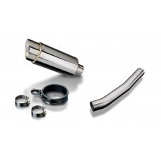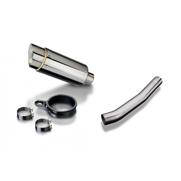 • This set includes - Delkevic silencer with a removable baffle, link pipe, clamps, and strap.