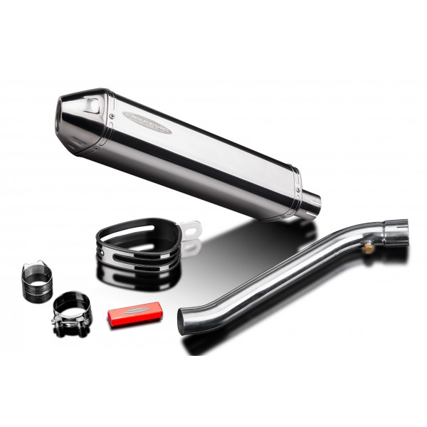 • This set includes - Delkevic silencer with a removable baffle, de-cat link pipe, clamps, and strap.